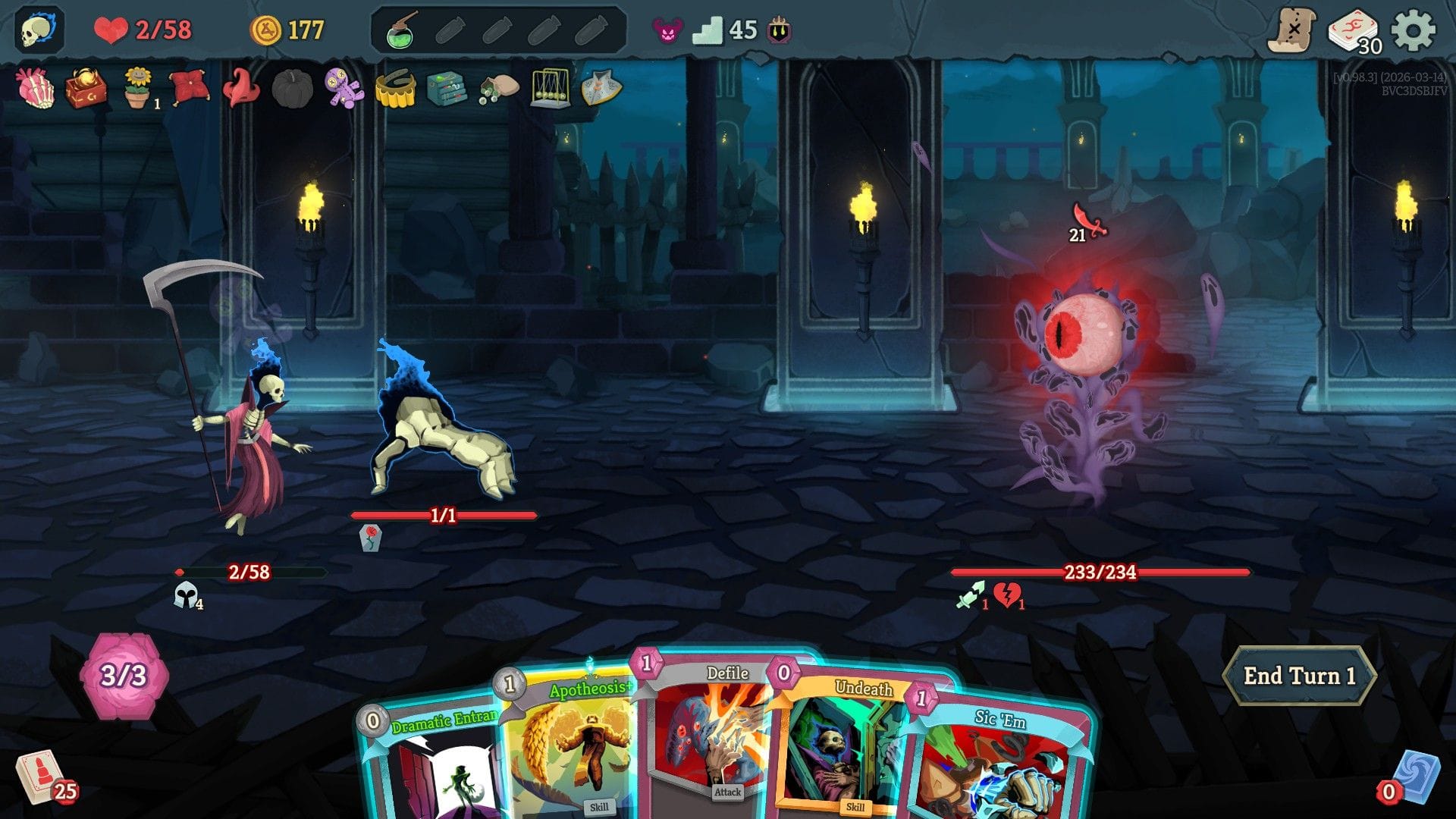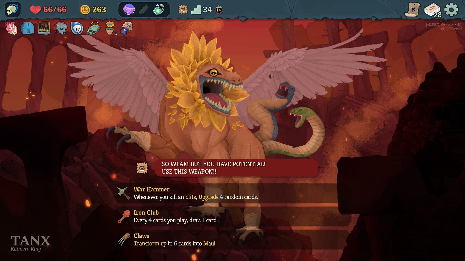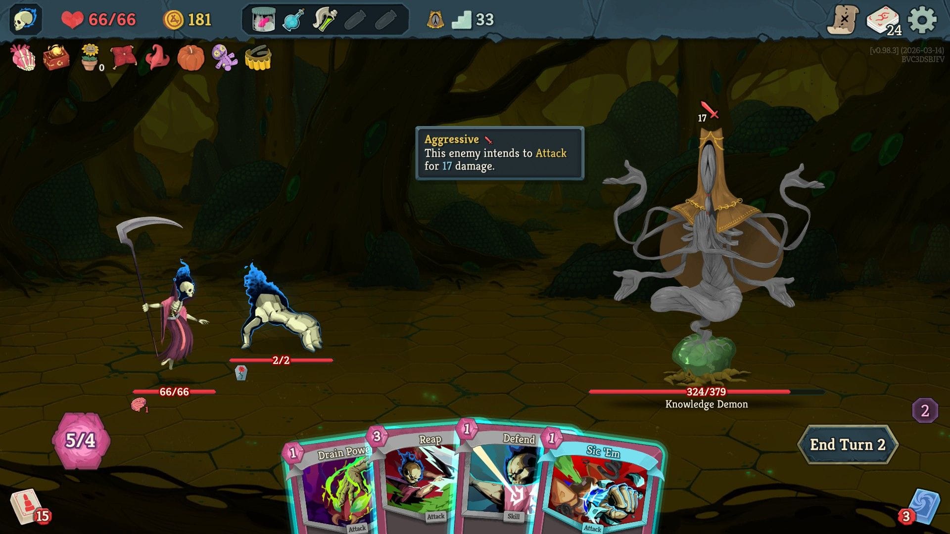 If the enemies provide blurts of pained delight, one of the new playable heroes is widening my smile further. The Necrobinder is a grim reaperess with a big scythe. She is not immortal, but her giant pet skeleton hand is. Every time this left mitt dies it comes back to life on the next turn. You can pump it up with extra health and instruct it to attack the baddies on your behalf, and it will absorb damage heading your way too. It has very low health to begin with (a single hit will often crumble it to dust every turn) but there are ways to beef the little guy up until you're smashing enemies like a chaotic toddler with one of those big green Hulk hands.