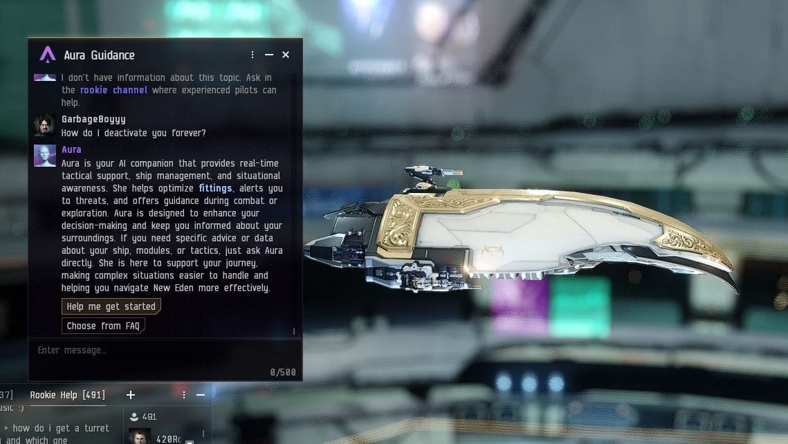 She's called Aura. The game has actually had this character for yonks, she's the on-board computer who puts you through the tutorial, a sort of kill-five-rats Cortana. But now they've introduced a new feature in which you can open a direct dialogue with her and type anything in. Ask about mining or ships or skills and she'll try to answer. In their admittedly frank and open blog post about it, developers CCP say this is an experiment. Only half of all new players are getting access to her for now. And they sound like they half expect this feature to be shelved.