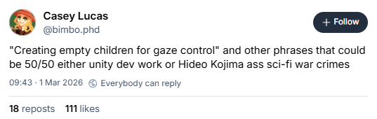 Beyond these delicately yellow-tinted walls, there was some good game news: Marathon is doing well, Slay The Spire 2 is doing amazingly, Resident Evil 9 is doing even better and is also a PC game now, because Capcom is increasingly a PC publisher. Chun-Li, welcome to the resistance. In bad game news Highguard threw in the towel and is shutting down, although the remains of the dev team crunched out a final update for the sendoff. When the lights go out it will have lasted 46 days in total, which is 31 days longer than Concord but still a very bleak outcome for four years of work.