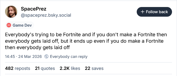 Beyond our hallowed walls, the magic 8-ball of games news remains stuck firmly on LAYOFFS as Epic canned 1,000 staff. The layoff announcements have become so regular and the numbers so huge that it can be challenging to visualise them, but looking at an incomplete list of the freshly-unemployed (which contains less than half of those affected) helps to bring it home: one of those documents so long it’s a physical chore to scroll through, listing lives across the world suddenly cast into a historically terrible job market. We cannot go on like this, and yet somehow we keep doing so.