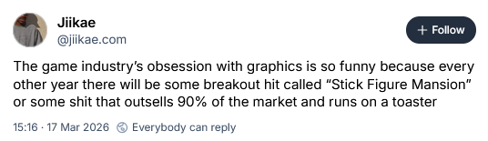 Elsewhere in Discourse, Crimson Desert came out and it’s just okay, which was enough for a big row about reviewers although it seems to be doing just fine so expect the coverage to continue until traffic levels improve. It may also contain AI which people are unhappy about, which is bad news for those people and every other game with AAA pretensions that ships this year. Marathon is also doing just fine although the relative shortage of reviews suggests that people are still making up their minds about it, perhaps because it’s extremely mean.