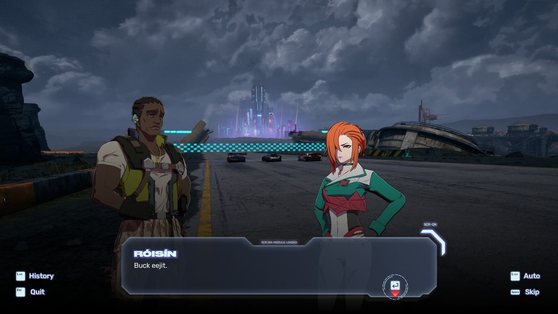 If Screamer lacked its own identity in the '90s, this unlikely reboot is an attempt to finally claim one. Instead of taking its cues from Sega's AM2 racers as the original did, the aesthetic here is urban, cyberpunk and anime, with a prominent story told through cutscenes and visual novel dialogue seemingly inspired by death games, Redline, and many anime shows. It sometimes feels like Dispatch with arcade racing in place of any other minigame.