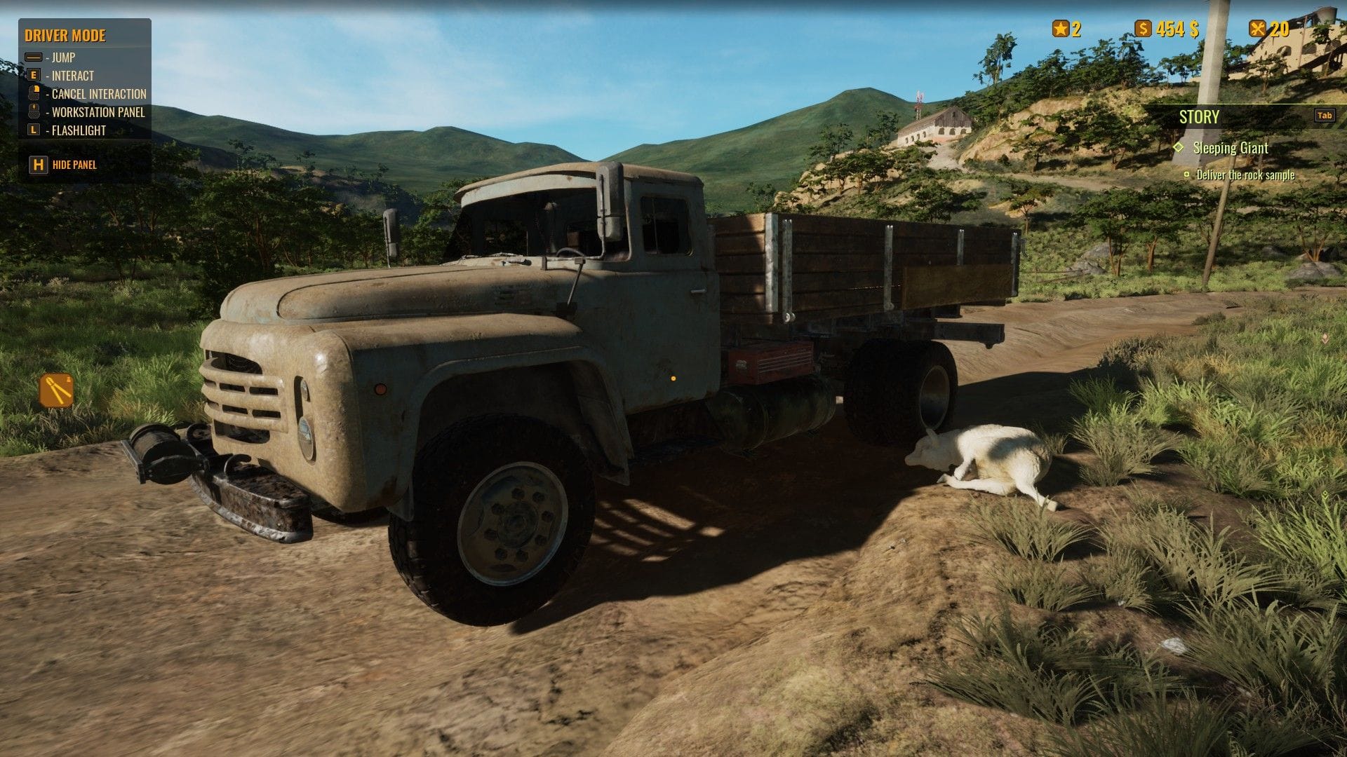 I grit my teeth and carry on towards a hill in the distance, my objective marked on the map. I try to at least enjoy the scenery. But even here there is trouble. I won't get into the nuts and bolts of how this game has been optimised for different PC hardware but the choppiness and general ugliness is evident at every muddy corner. The approach to lighting is particularly awful, sometimes automatically blasting machinery with an overpowered flashlight such that you can no longer see the fusebox components you're trying to remove. Sometimes tinting your truck's windshield with the aggressive UV filter of an overzealous pair of ski goggles, to the point that you can't see in broad daylight and need to put the headlights on. The Unreal Engine has been abused in some extreme ways here. Or else Unreal Engine has abused the game developers. It's hard to tell sometimes.