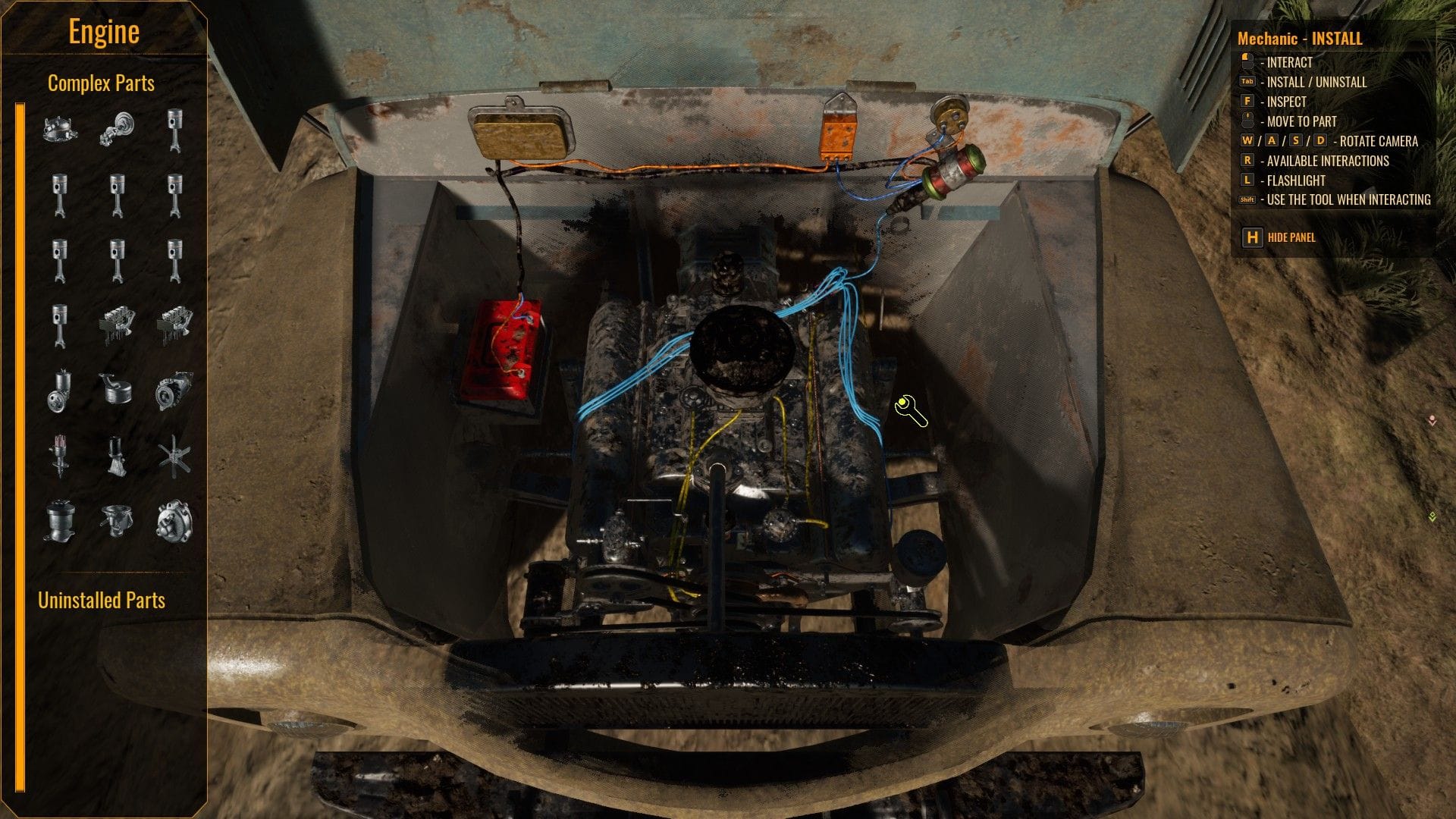 I hop out of the truck, perhaps only an hour or so into exploring the open landscape of the game's first zone. I am faced with both a rockslide blocking the path, and a wheel that is uncooperative for reasons I have to figure out. At this early point, Truck Mechanic feels familiar but faintly promising. As in Car Mechanic Simulator, you have to zoom-in-ishly inspect your motor's bits and pluck parts off one by one as they become highlighted in green. You unscrew and prybar, getting deeper and deeper into layers of machinery, until you hit upon a broken piece that needs to be replaced or fixed. The vehicle is recreated with loving accuracy.