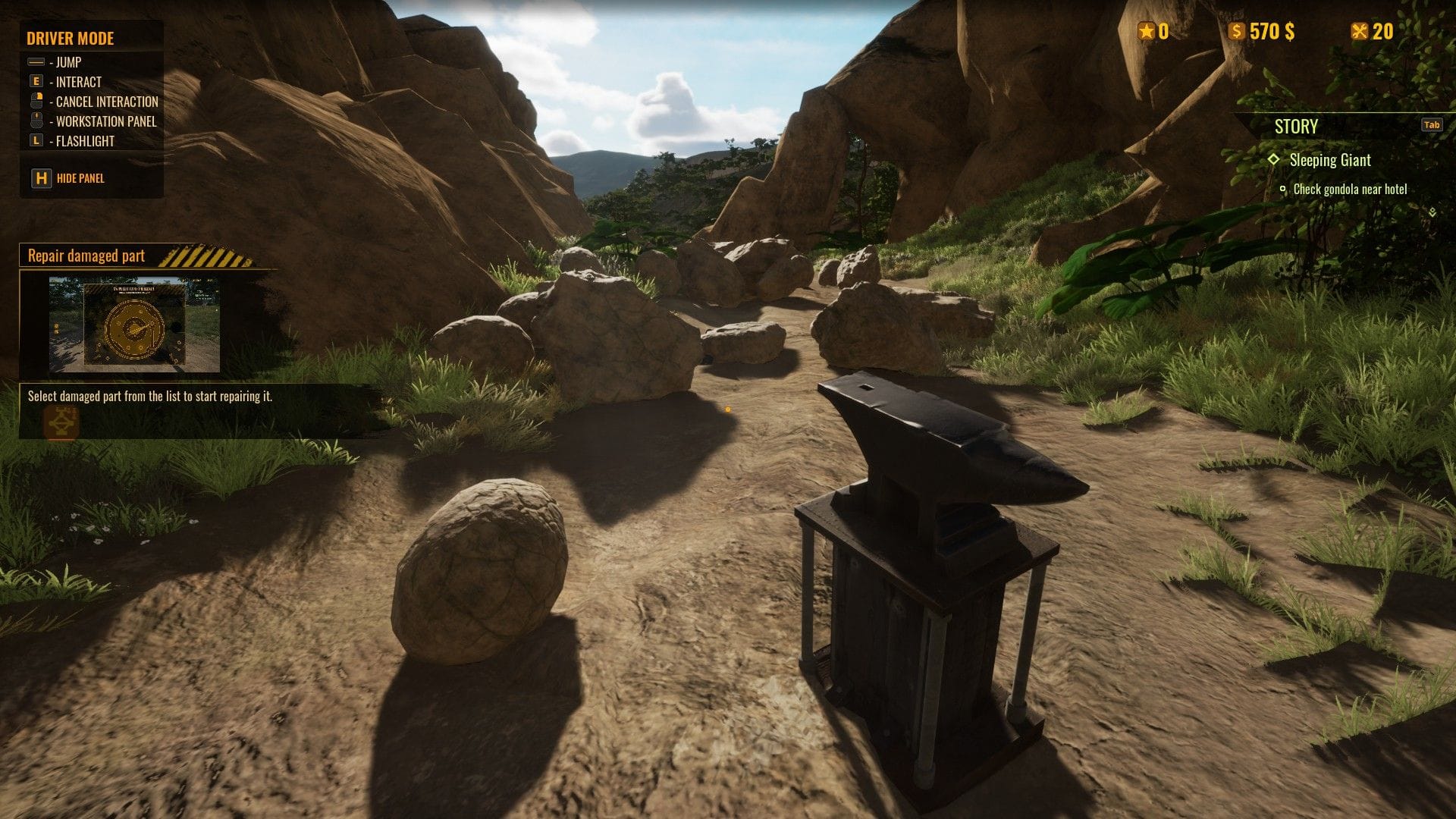 Lots can be fixed with this anvil, which you can plop down anywhere with the inexplicable power of King Kong moving an entire phone booth as a chess piece. You approach this fixin' station and repair car parts there using the anvil's embedded wrench-twistin' minigame. I fix the spring, put the wheel back together, and finally lug the huge boulders of landslide out of my truck's way one by one, with exactly the type of tyrannical strength you'd expect from a man who carries 300 lbs of iron in his jeans.
