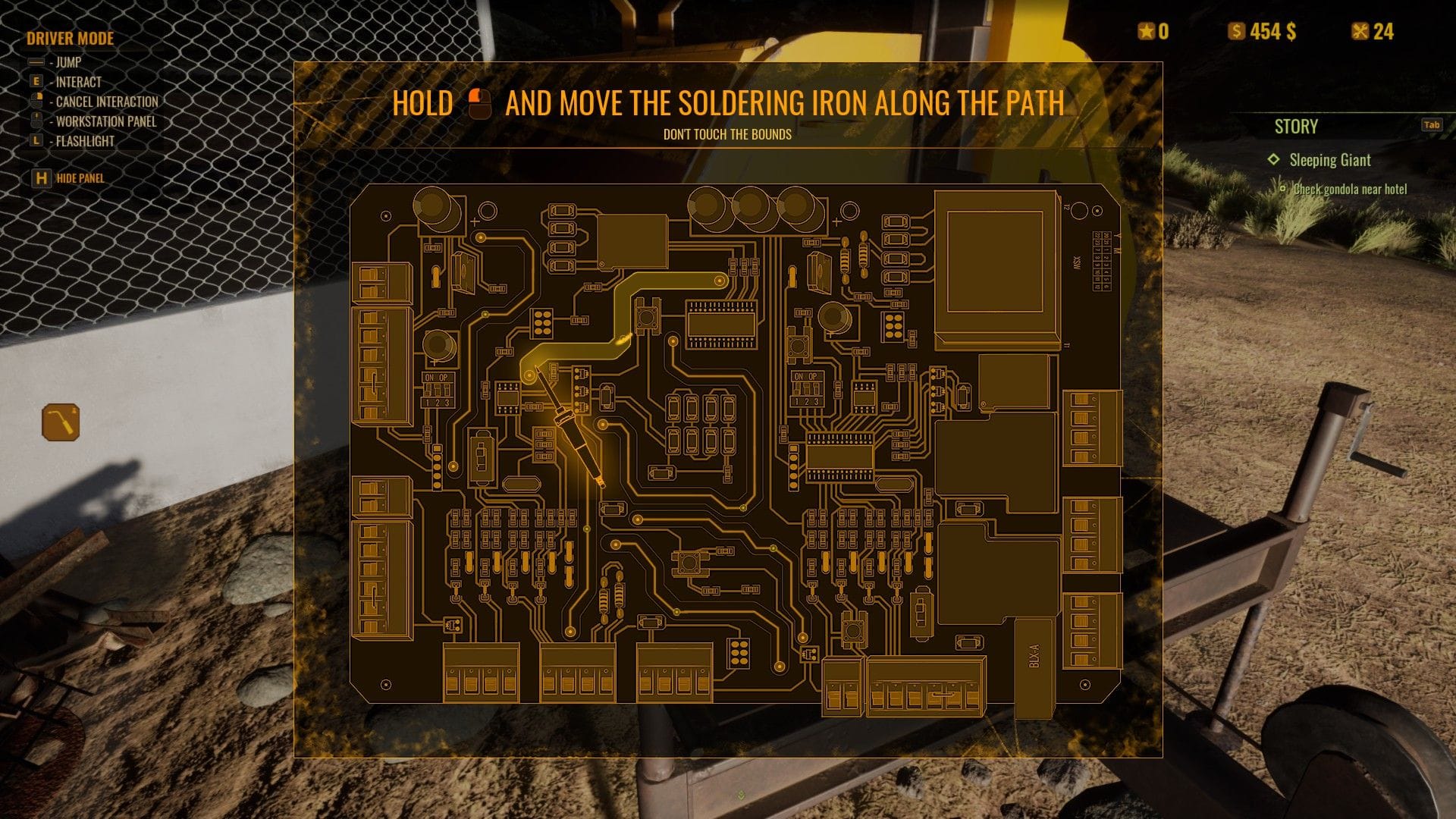 More fixin' minigames make themselves known. A soldering iron lets you play a tiny game of circuit board Operation to fix electrical gizmos like the big broken light. And your truck is full of other tools - wire cutters for getting through that fence, a gas cannister for storing backup petrol. The systems emerging here are simple, but I often like this in a job sim. They offer a conglomeration of many simple tasks which, when mooshed together, accumulate into a meditative mini career.