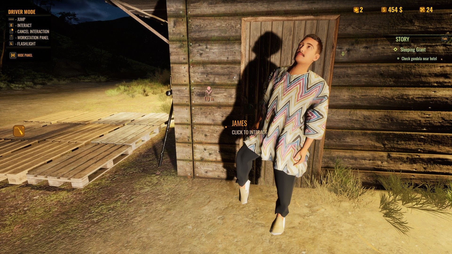 Unfortunately, I am about to meet one of the Truck Mechanic's many joysappers - its "people". As I drive up onto the next hill I finally run into another human. It is my contact in this world, a rubber-faced man in a poncho called James who is habitually shaking one leg, then the other, then back to leg number 1, and so on. Imagine a cat who has walked in cold soup, and cannot kick the bits of onion off his back paws no matter how hard he tries.
